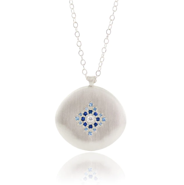 Reminiscent of a cluster of stars. This silver pendant is set with aquamarines, sapphires and a diamond center.