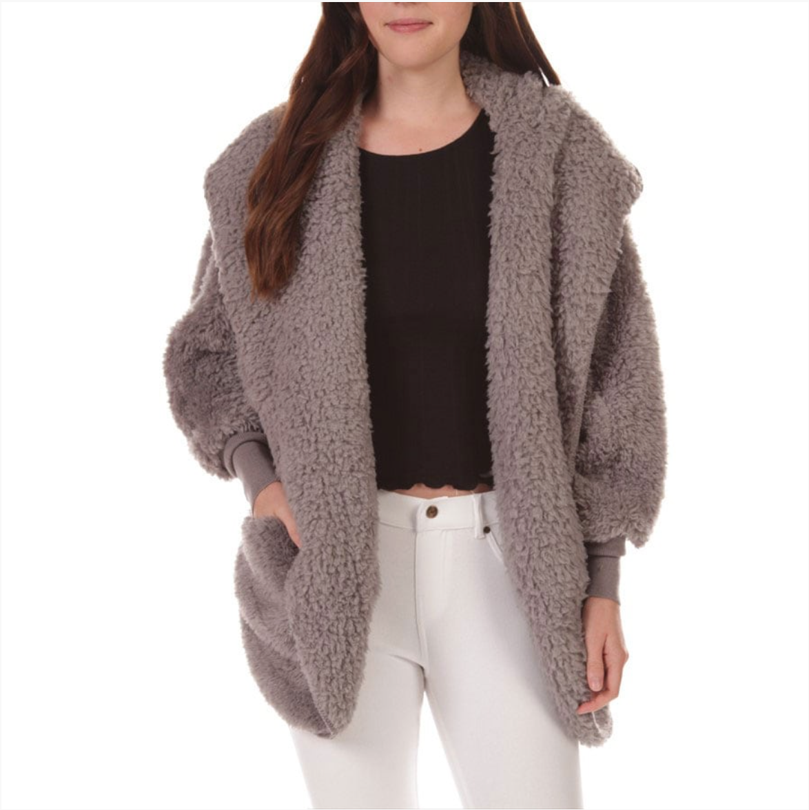 When a hot summer day on a SoCal beach turned cold quickly, the sight of how a girl had wrapped herself up in a blanket and the way it draped around her inspired this cozy layering piece. Rendered in unbelievably soft and plush sherpa-style fleece that's as light and fluffy as cotton candy, it makes the perfect gift for yourself or a friend.
