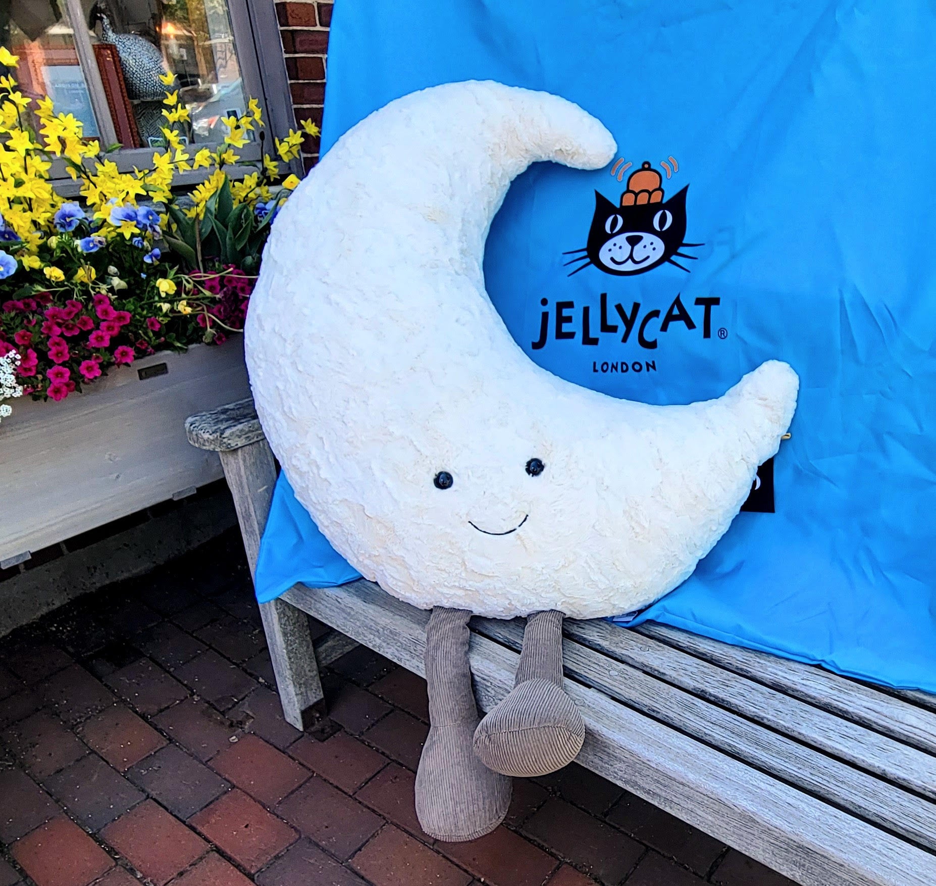 Gorgeously textured with velvety craters, Amuseables Moon is full of fun! A midnight matey for bedtime hugs, this pearly-white pal is curvy and cuddly. With squidgy cord booties, a weighted bottom and a peaceful smile, this moon's waxing poetic! A magical crescent and a marvelous present.