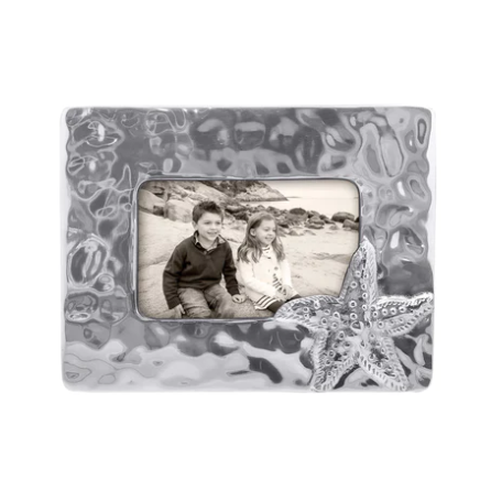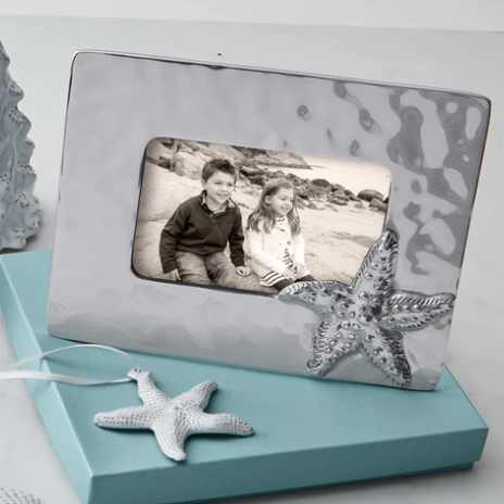 Combine the form, function and gentle wave inspired texture of our Shimmer Collection with the whimsical beauty of our Seaside Collection then just sit back and relax as the sea gracefully wanders into your home decor. Our 4" x 6" Starfish Shimmer Picture Frame is the perfect way to preserve life's treasured moments. Handcrafted from 100% recycled, buffed-until-brilliant aluminum. Beautifully boxed in a Mariposa Gift Box - we make gifting easy!