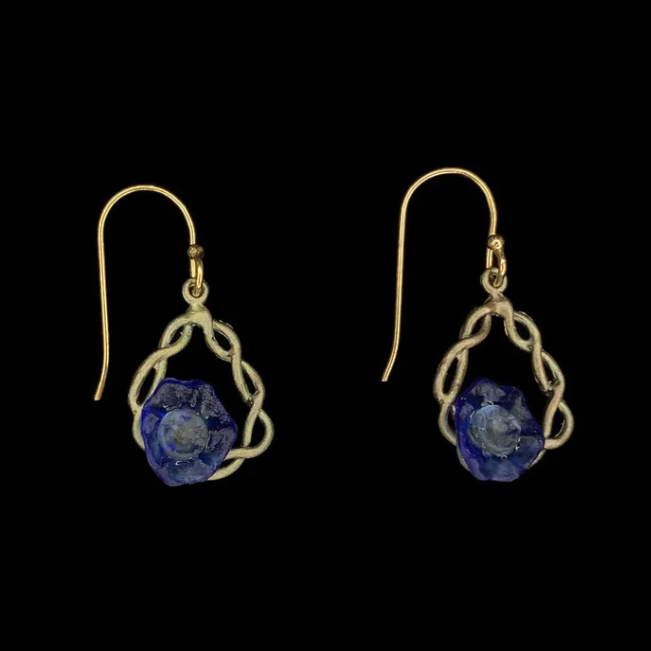 Materials: The Morning Glory Earrings are cast in hand patinated bronze and accented with navy and light blue cast glass flowers. The wires are 925 Sterling silver with a 24kt gold plating.