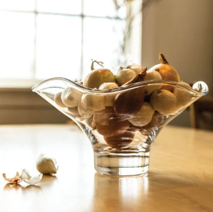 The ruffled rim of this special bowl was inspired from flower petals. An exceptional serving bowl for the artistic table. Each bowl is a handblown piece, and one-of-a-kind